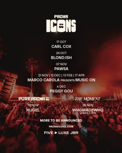 The Pacha ICONS series returns this October 2025 with techno titan Carl Cox followed by the likes of Marco Carola, BLOND:ISH, PAWSA, HUGEL Pure Pacha, and Peggy Gou.